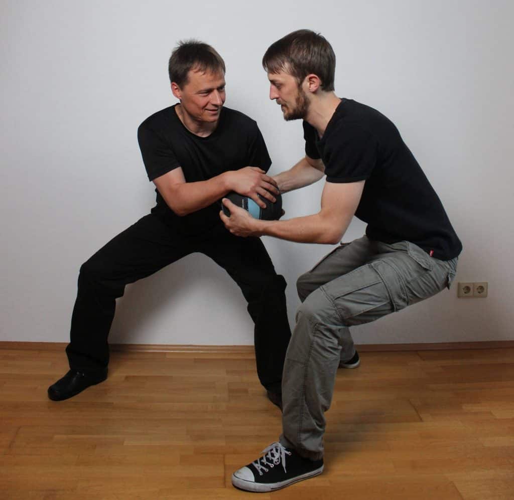 Wir nutzen unter anderem Medizinbälle, Stäbe, Rollen und anderen Hilfsmittel, um grundlegende Bewegungsmuster – 8er, Wellen, Spiralen, Kreisbahnen – im 1:1-Training einzuschleifen.